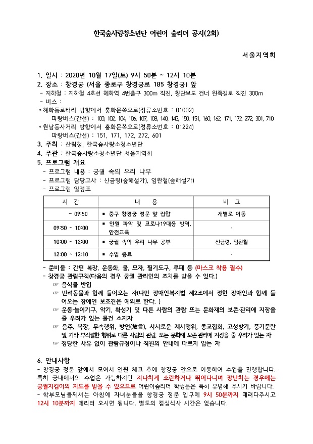 ⦁ 첨부파일 붙임1)2회_어린이숲리더 공지사항.hwp 붙임2)2회_어린이숲리더 활동지.hwp 붙임3)2회_어린이숲리더 안전지도자료(코로나19 수칙안내포함).hwp