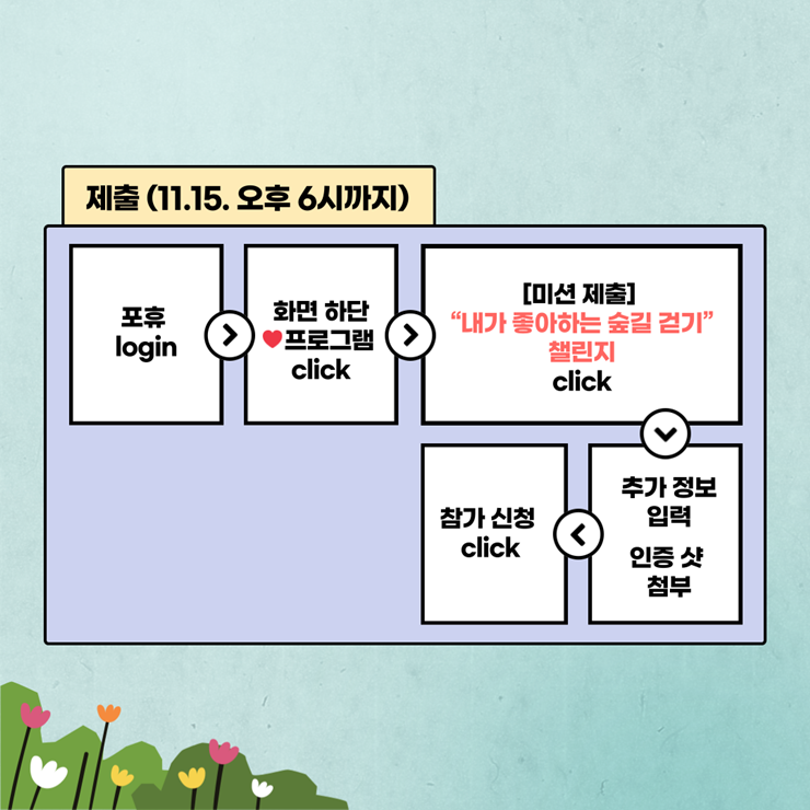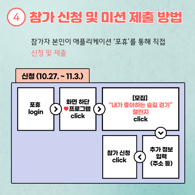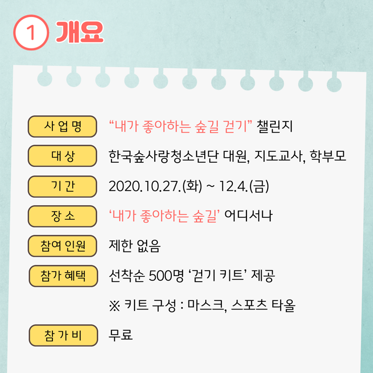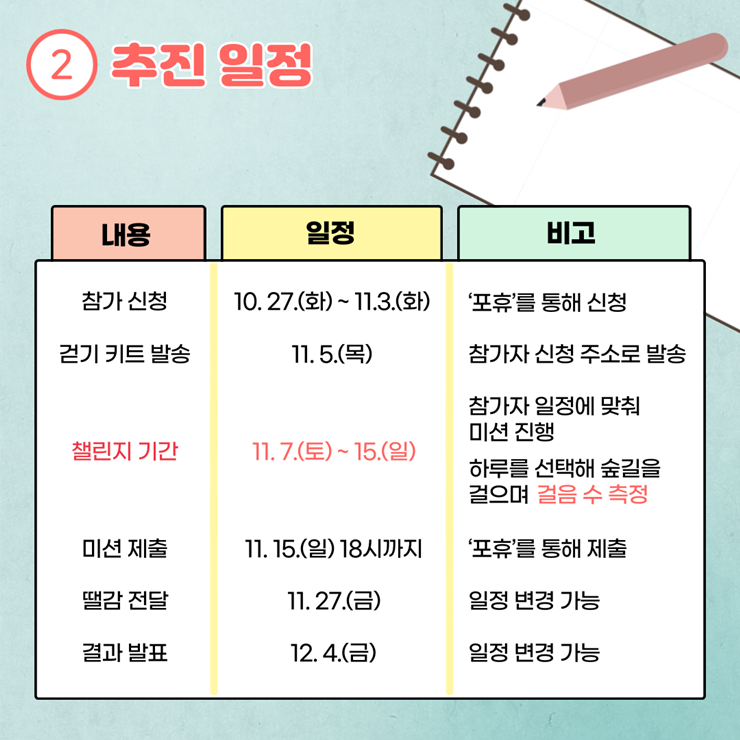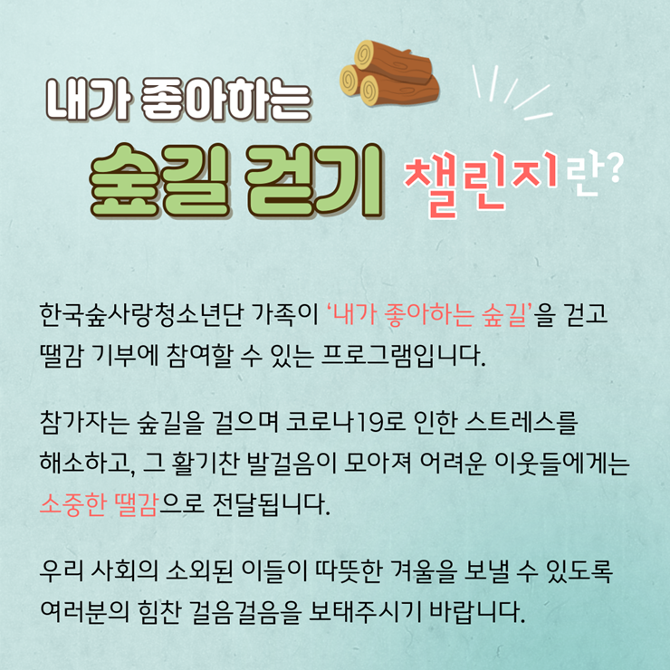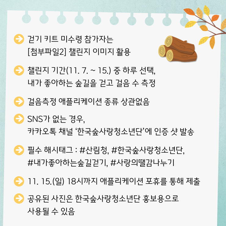 ⦁ 첨부파일 [붙임1] 내가 좋아하는 숲길 걷기 챌린지 계획.hwp [붙임2] 챌린지 이미지.png