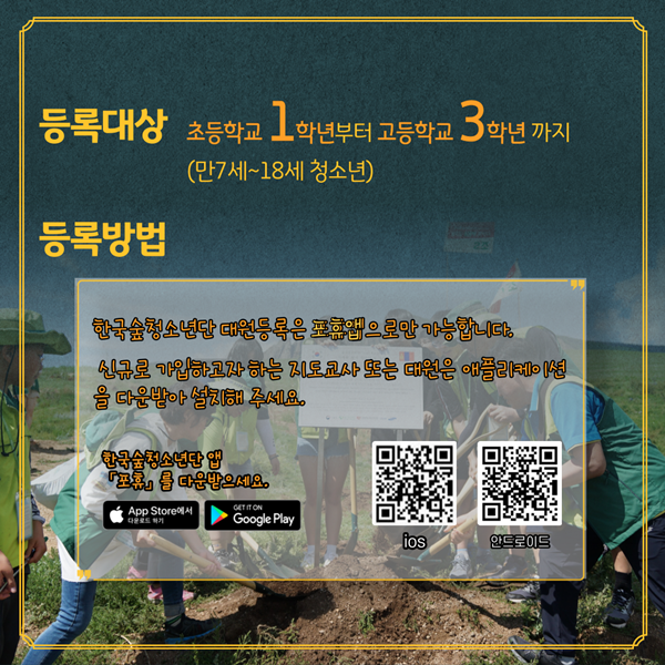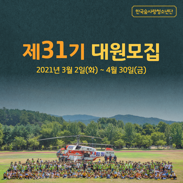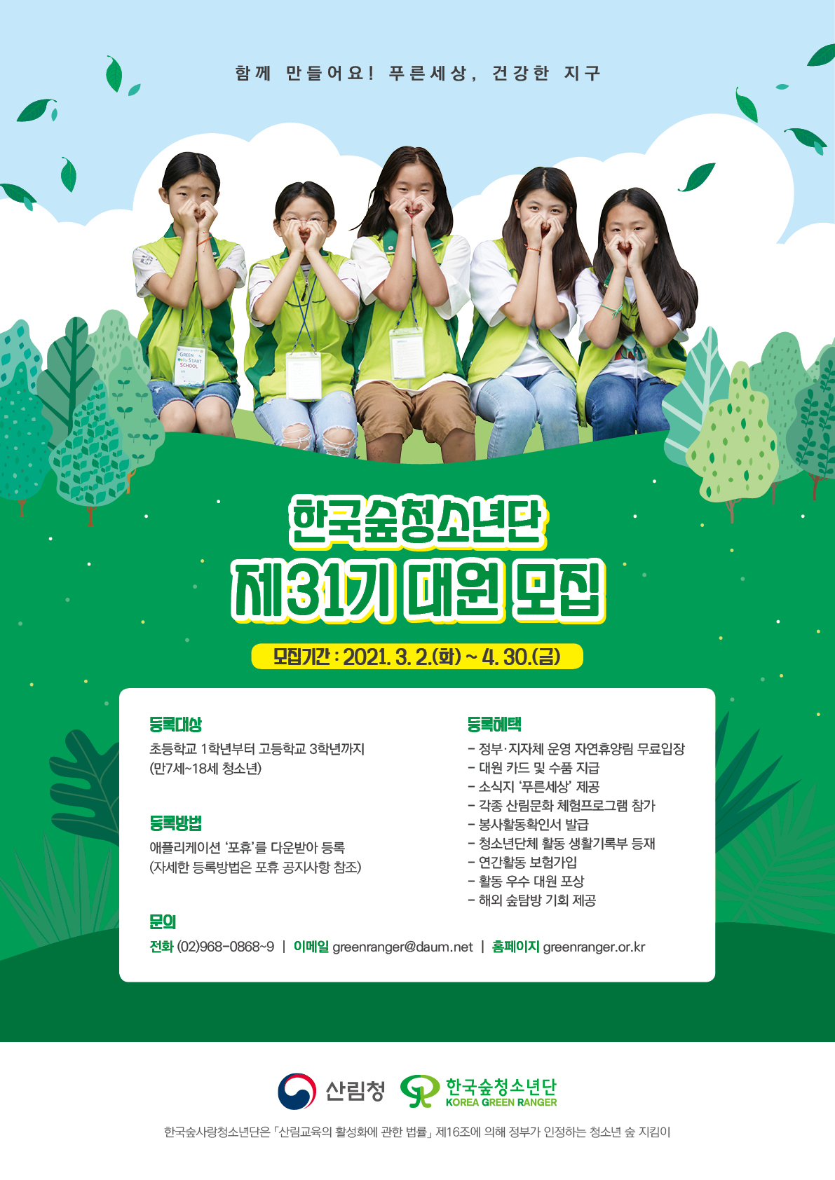 ⦁ 첨부파일 [붙임2]2021년 한국숲사랑청소년단 육성계획 및 모집안내.pdf [공문]2021년 한국숲사랑청소년단 대원 모집 안내.pdf [붙임4]포스터.jpg