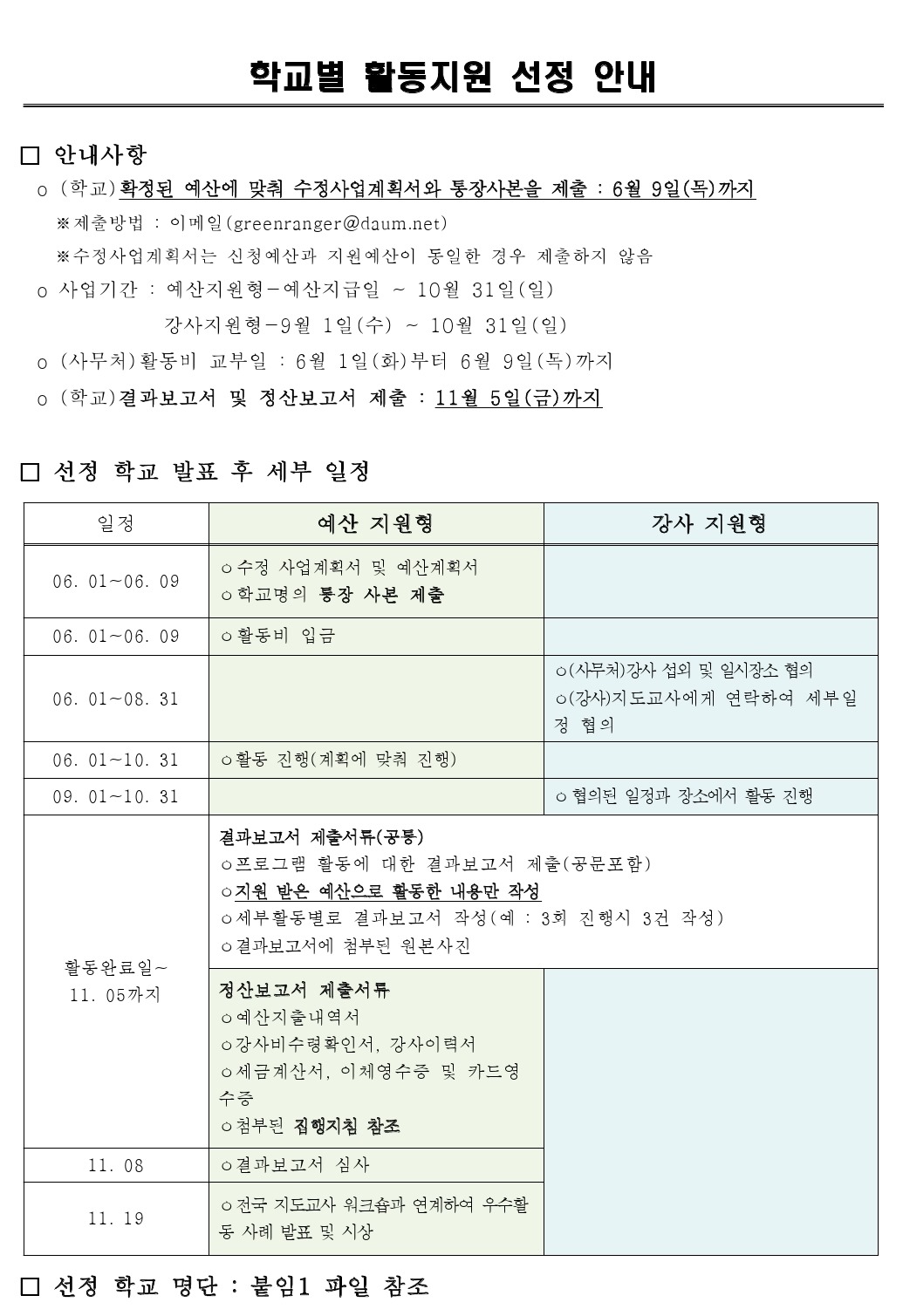 ⦁ 첨부파일 [공문]학교별 활동지원 프로그램 선정 안내.pdf [붙임1]학교별 활동지원 선정 안내.hwp [붙임2-3]예산지원형 및 강사지원형 결과보고서.zip