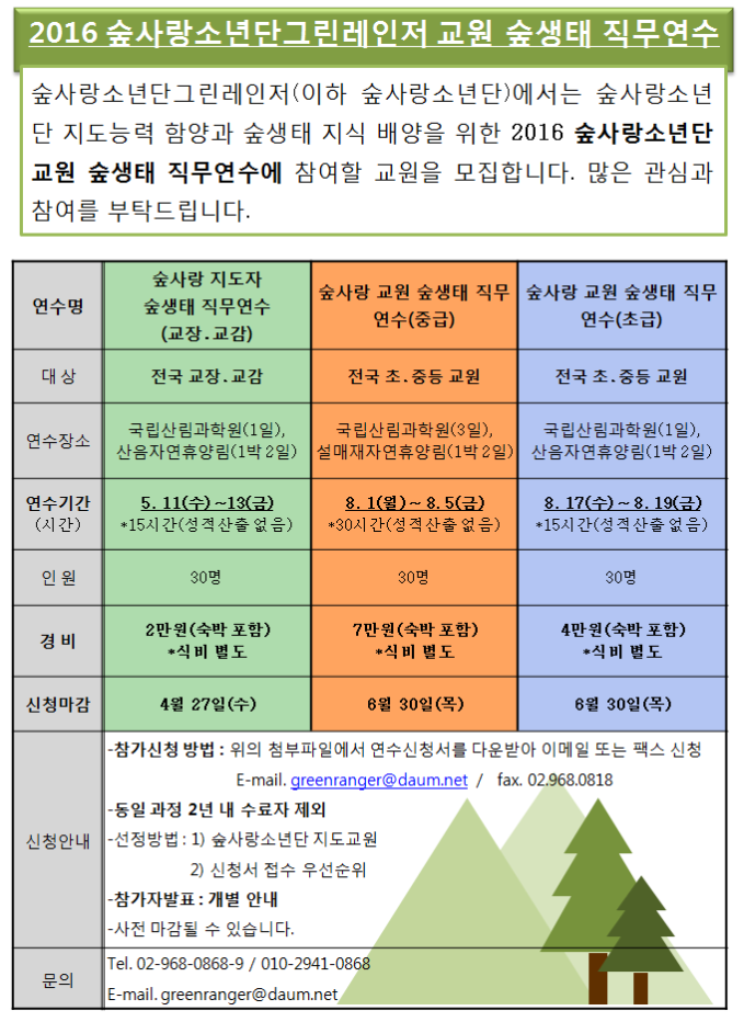 ⦁ 첨부파일 공문)교원 숲생태 직무연수.pdf 2016 직무연수 계획(공지용).hwp 붙임)직무연수 참가신청서.hwp |