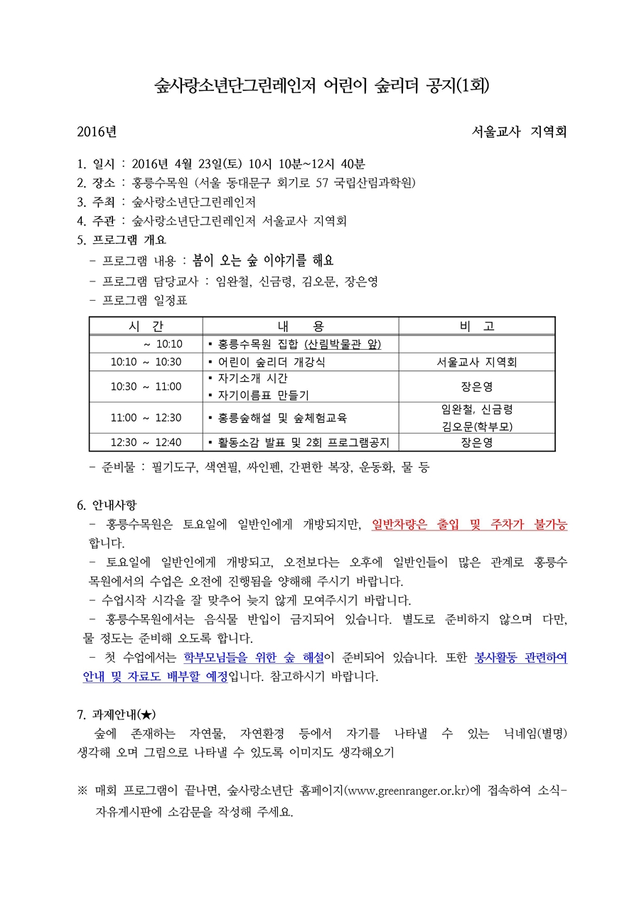 ⦁ 첨부파일 어린이숲리더 유인물.hwp 1회_어린이숲리더 공지사항.pdf |