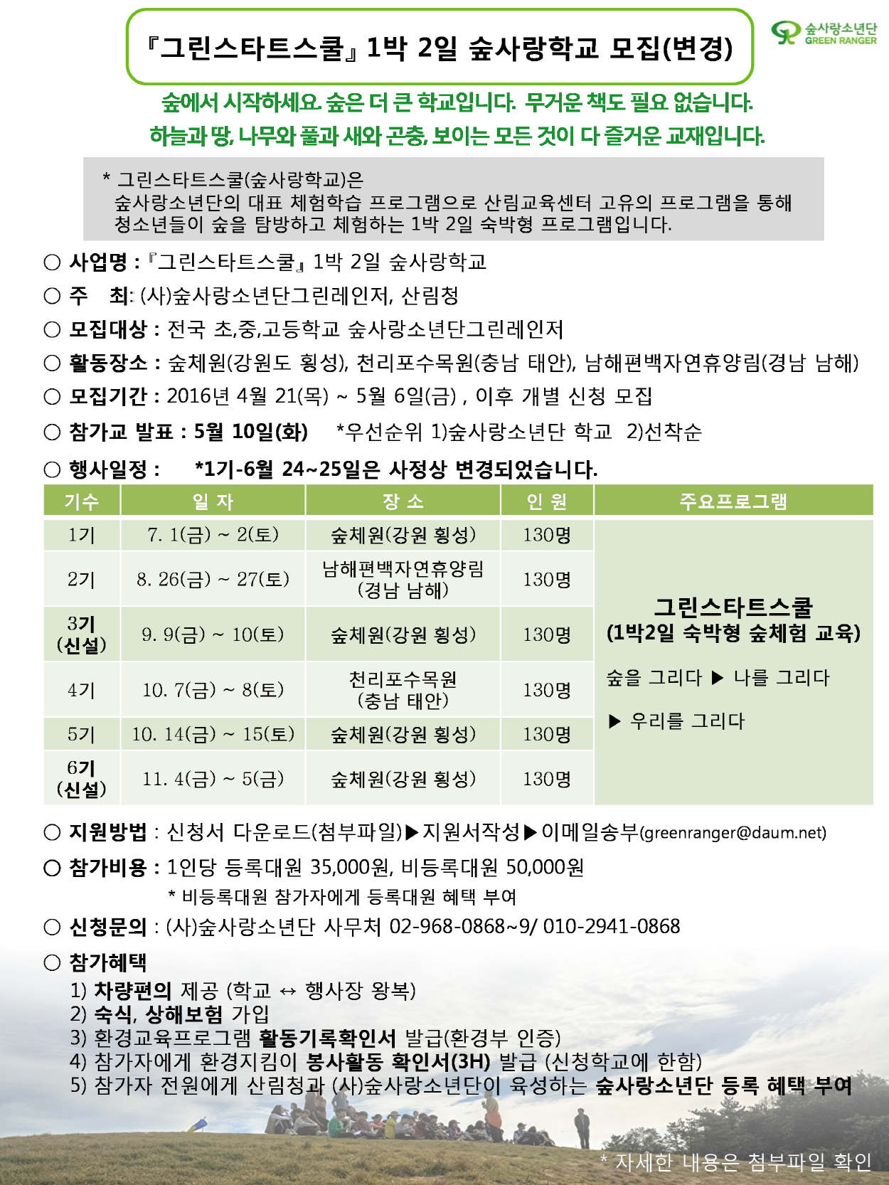⦁ 첨부파일 붙임 1)그린스타트스쿨 계획(변경).hwp 붙임 2,3)참가신청서&명단(변경).hwp (공문) 그린스타트 스쿨(일정변경).pdf |