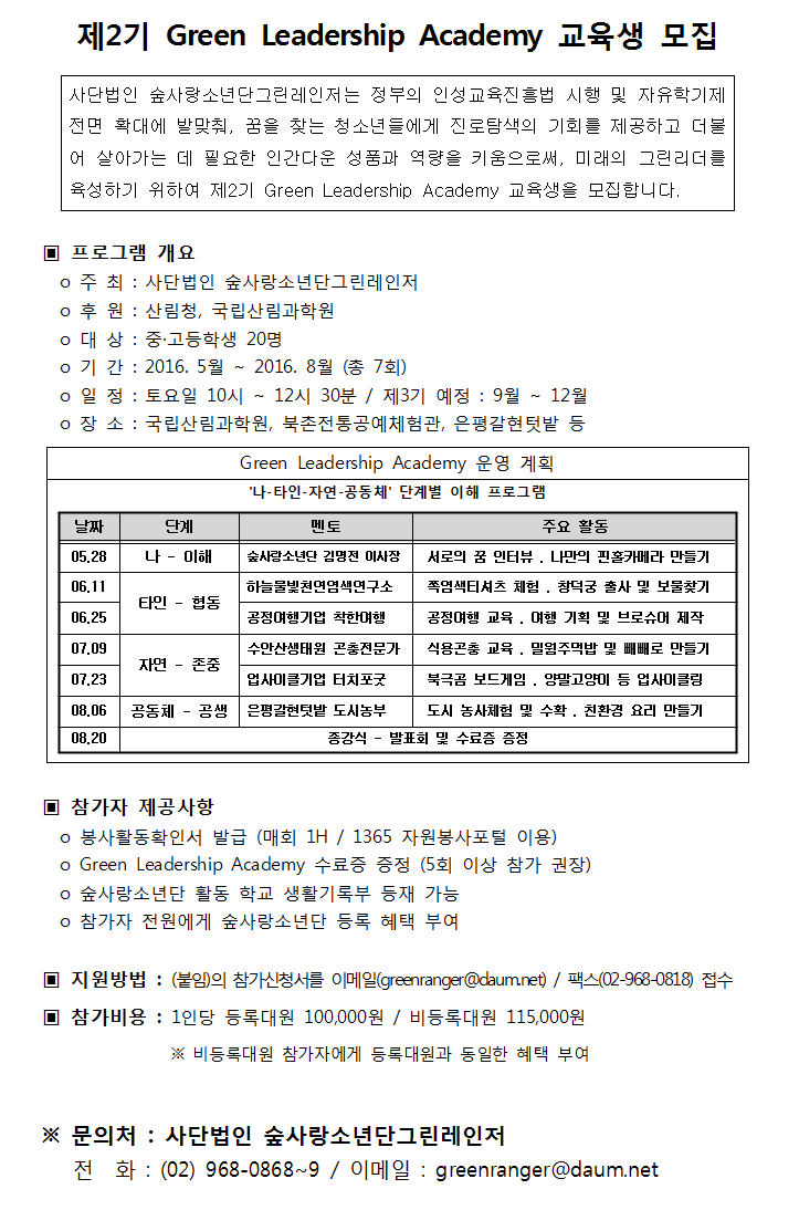⦁ 첨부파일 (공문)그린리더십 아카데미.pdf 제2기 그린리더십 아카데미 계획.hwp 참가신청서.hwp