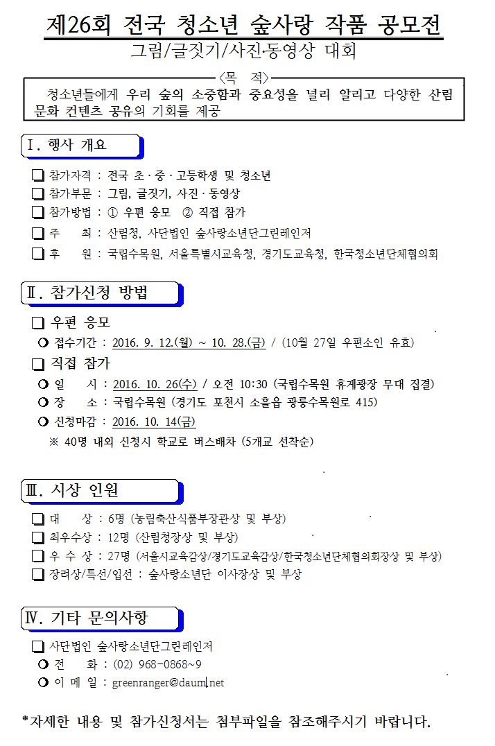 ⦁ 첨부파일 (공문)제26회숲사랑작품공모전.pdf 제26회 작품공모전 계획(신청서 포함).hwp